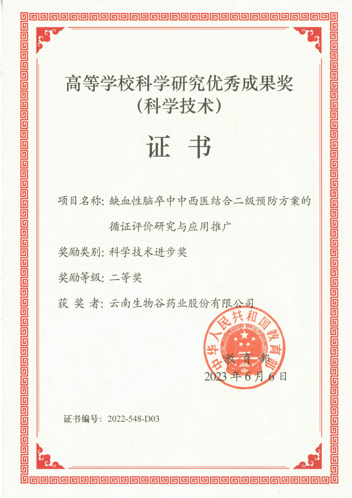 近日,2022年度國家高等學??茖W研究優秀成果獎(科學技術)獎項評定頒布,由廣州中醫藥大學牽頭、云南生物谷藥業股份有限公司聯合共同完成的“缺血性腦卒中中西醫結合二級預防方案的循證評價研究與應用推廣”項目榮獲國家教育部科學技術進步獎二等獎,這是本年度廣州中醫藥大學唯一牽頭獲得該獎項的項目,也是我公司首度與高校科研機構研發合作獲得教育部重大獎項。